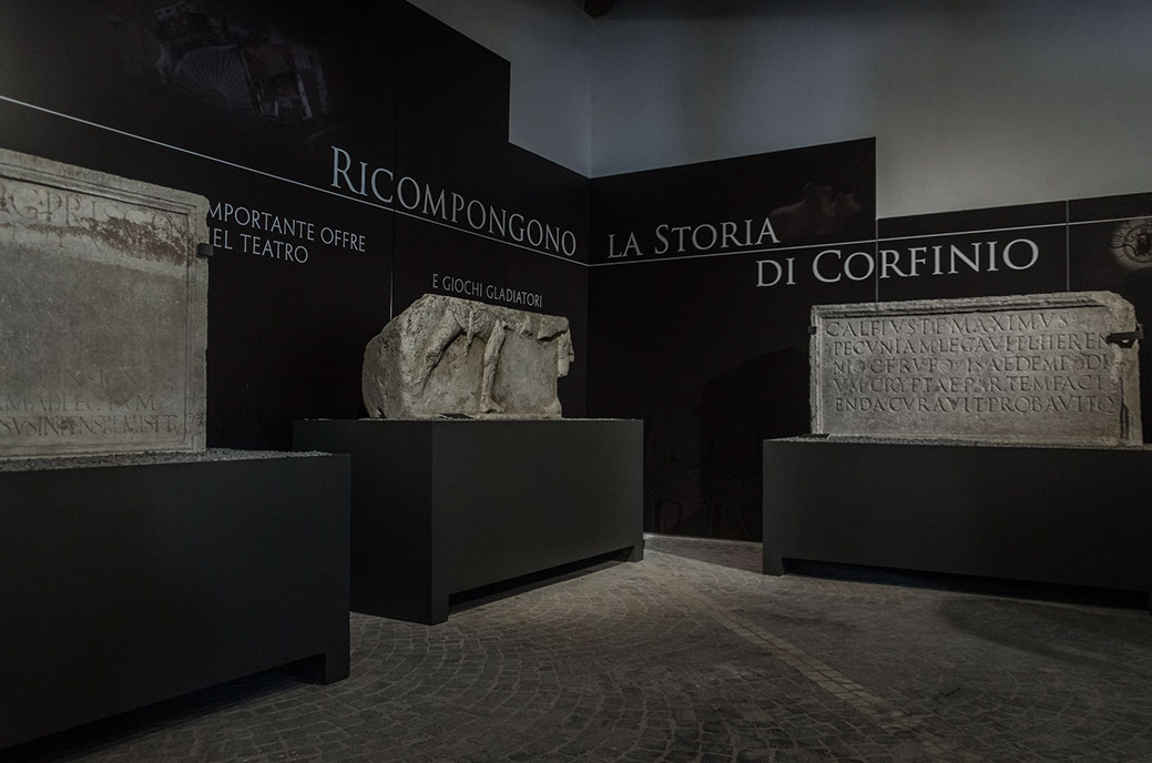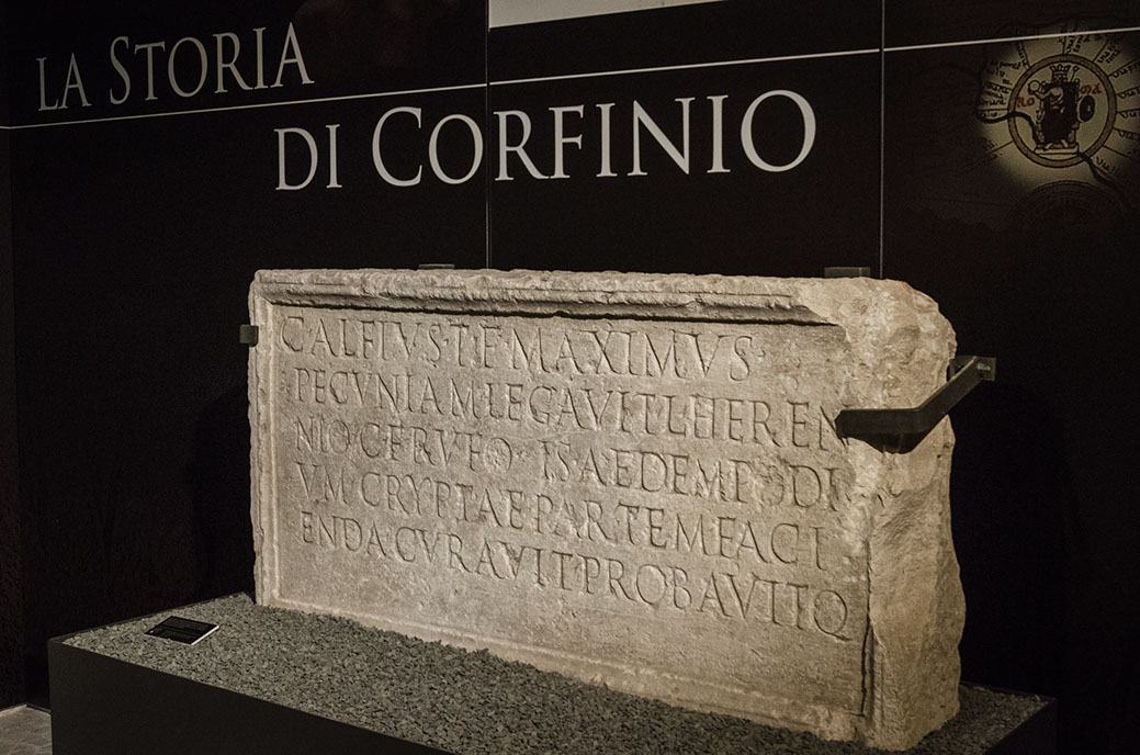 Si tratta di una collezione di epigrafi contenute in un edificio che architettonicamente rispecchia la forma di un edificio romano con il l'impluvium per la raccolta dell'acqua piovana. Le prime epigrafi che incontriamo sono state scoperte a fine Ottocento nelle campagne di scavo di De Nino; troviamo cippi votivi che costeggiavano la strada per il tempio, Dove sopra erano incastonate le statuine di Ercole Curino; bassorilievi decorativi e coperchi di tombe a grotticella, più avanti epigrafi che citano Corfinium in varie scene di vita quotidiana, per esempio la ristrutturazione di un tempio oppure un bassorilievo che parla di Ludi gladiatori lasciando intendere che a Corfinio dovesse esserci anche un anfiteatro oltre che un teatro.