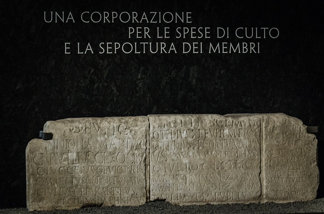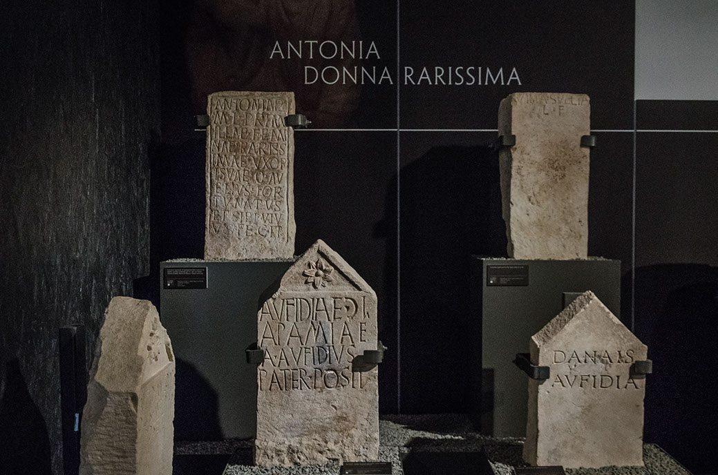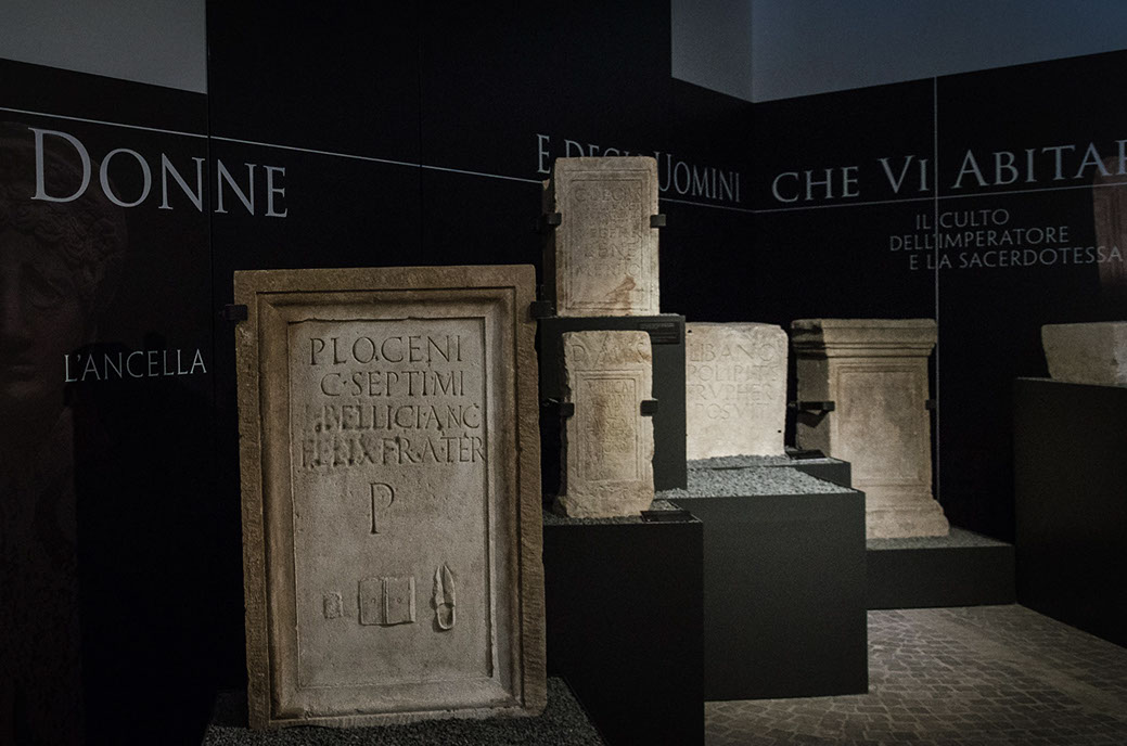 Ancora troviamo epigrafi in dialetto peligno, le più lunghe ritrovate o dopo quella conservata a Napoli di cui vediamo una fotografia sulla parete. Questo dialetto era molto simile al latino ma aveva delle particolarità, Ad esempio la contrazione tra la h e la e che possiamo vedere nel coperchio di Tomba che si trova verso il vetro Dove troviamo queste due lettere attaccate e nella parola herclit, infine iscrizioni dedicate a donne che rivestivano ruoli importanti come ad esempio maestre o altre figure che normalmente erano ad appannaggio di uomini, questo perché i Peligni che abitavano in questa zona, erano per lo più soldati e quindi spesso in viaggio per campagne di guerra ; la mancanza di uomini ha fatto sì che le donne rivestissero questi ruoli e si emancipassero prima rispetto ad altre popolazioni.
