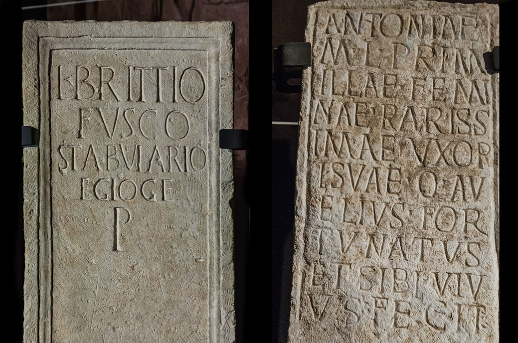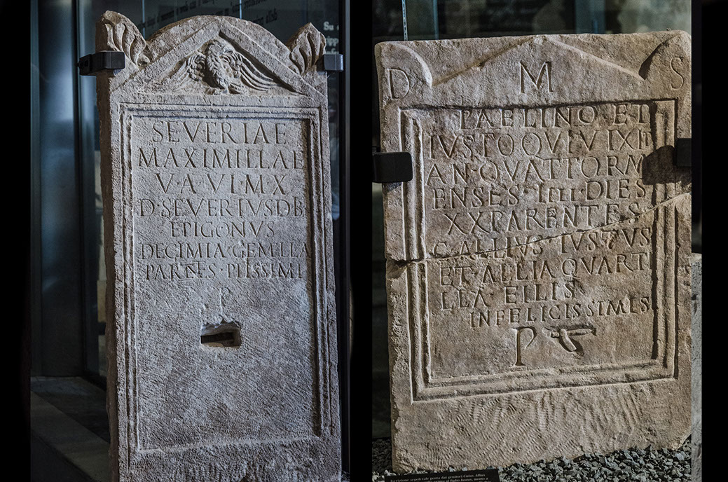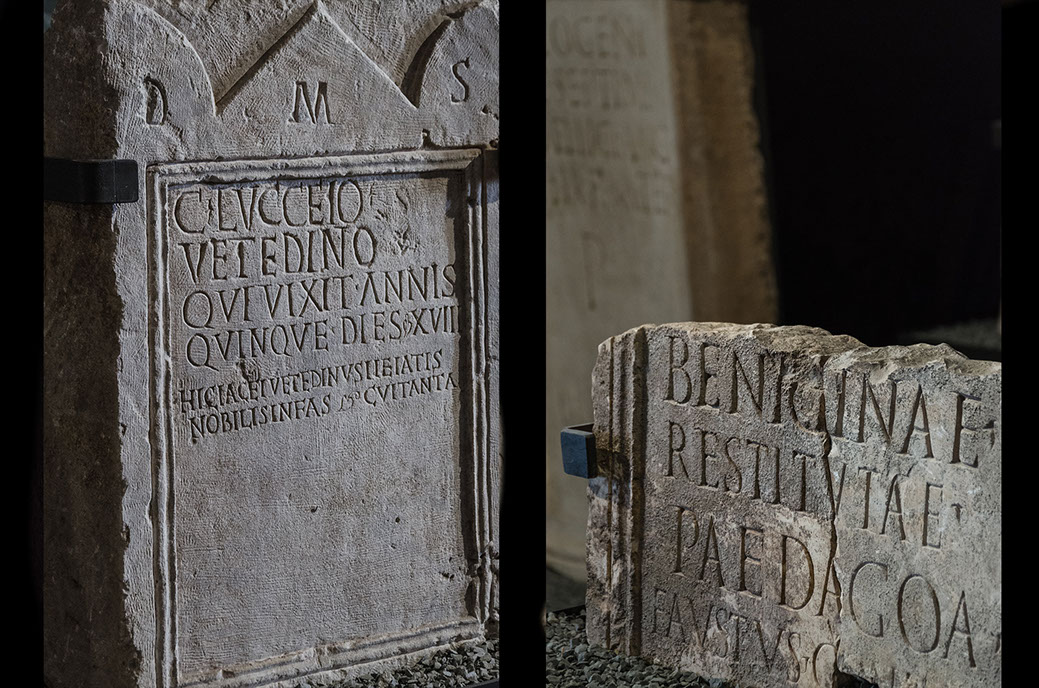 Poi troviamo lapidi di bambini, le riconosciamo perché più decorate rispetto a quelle degli adulti e Notiamo che in alcune ad esempio quella dedicata a Pelino e Justus il secondo nome è stato aggiunto successivamente rendendo al plurale tutti i termini che inizialmente erano singolari, questo perché la mortalità infantile era molto più frequente di oggi e questa in particolare testimonia il culto verso San Pelino, uno dei primi santi cristiani che già veniva veniva venerato in questi luoghi dove oggi sorge l'attuale cattedrale.