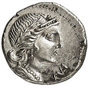 Testa di Bacco a destra, con corona di edera legata con nastro. Il tutto entro una ghirlanda d'alloro.